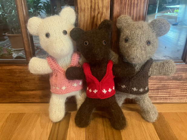 For the smaller bear, I made Harry in Lopi Lite yarn on size 9 needles and felted him. The vest for this bear is knit with the same pattern, but using sport weight yarn on size 4 needles.
